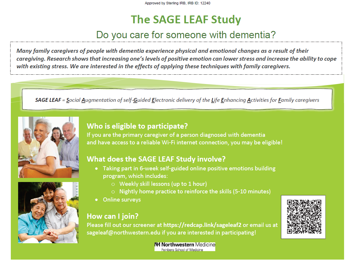 SAGE LEAF is an NIA-funded, online caregiver well-being study led by researchers at Northwestern University. The six-week, self-guided program focuses on building positive emotion skills to support stress management and resilience. In a prior study with 233 Alzheimer’s caregivers, participants experienced significant improvements in positive mood and reduced perceived stress compared to a control group.
